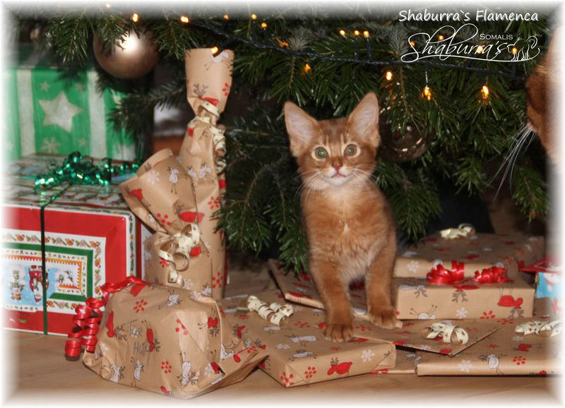 02.01.2015 - 13 Wochen alt Wie geht das nur? Wie können 13 Wochen nur so schnell vorbei gehen? Denn ruck zuck war es wieder soweit und unsere beiden Buben auszugsbereit. Eigentlich sollten sie noch eine Woche bei uns bleiben... aber da die neue Besitzerin der beiden Jungs noch eine Woche Weihnachtsurlaub hat, durften die Jungs dann doch mit 13 Wochen schon ausziehen. So haben die drei die erste Woche ganz für sich, die Jungs können sich einleben und Frauchen darf sich nach 3 Jahren katzenlos wieder daran gewöhnen zwei spielwütige Rabauken im Haus zu haben. Aber erst durften wir alle noch Weihnachten zusammen feiern... Alles Gute meine zwei Süßen... macht es gut. Ich wünsche Euch ein schönes langes unbeschwertes Leben! Ein Trost: Flamenca wird bleiben und somit habe ich endlich mal wieder ein Katzenkind mit dem Familiennamen “Shaburra`s”.