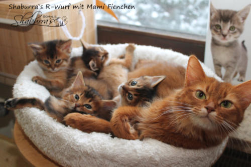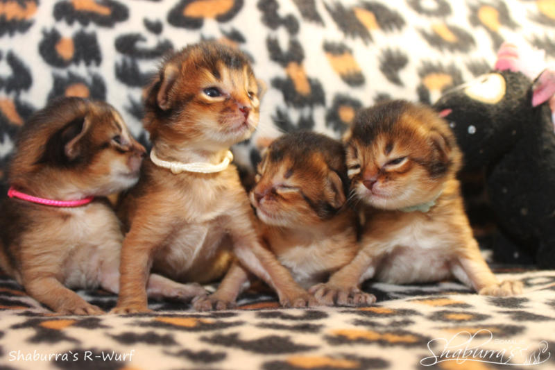 Nach fast einem Jahr Kittenpause… bekam ich langsam aber sicher Kitten- Entzugserscheinungen. Daher freue ich mich riesig, dass es mit der Deckung unseres Prinzesschen Fienchen mit dem tollen Olaf geklappt hat. Herausgekommen sind aus diesem Date 4 wildfarbene/ ruddy Somalibabys, die Fienchen zwar ein einer langen, aber absolut komplikationslosen Geburt das Leben schenkte. Anfangs war ich erschrocken über das kleinste Baby im Wurf… knapp über 60g… so ein kleines Mini-Mäuschen hatte ich noch nie und ich war gewappnet für evtl. hochpäppeln und Zufüttern… Aber die kleine Maus - das Rosinchen (der Name musste sein) hat das auch alleine alles geschafft und zeigte vom ersten Tag an im wahrsten Sinne des Wortes ihr Krallen. Alle drei nehmen kontinuierlich zu und so langsam herrscht Leben in der Wurfbox und dann gaaaanz bald im Kitten-Kindergarten und der restlichen Wohnung. Wir freuen uns riesig auf diese Kittenzeit im Herbst/ Winter.. genau die richtige Jahreszeit für Babys, wenn man ohnehin wieder mehr im Haus ist…