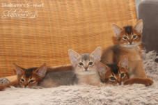 Geboren am 26.03.2024 Eltern: Eigerin`s Charisma x Shaburra`s Maxl II. von der Stoffelburg Alle Babys sind Abessinier Variant (Kurzhaar-Somalis) Santa Fee Aby Variant- wildfarben - weiblich (bleibt) Sky Princess Aby Variant - blue- weiblich (ausgezogen) Snuggles Aby Variant - wildfarben- männlich (ausgezogen) Speedy Gonzales Aby Variant- wildfarben- männlich (ausgezogen)