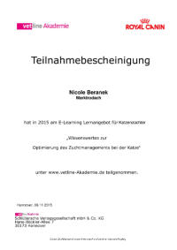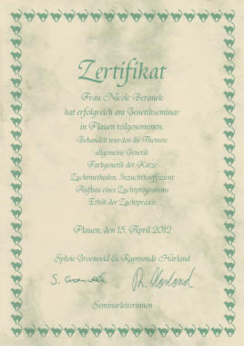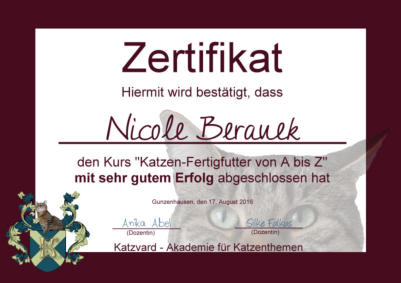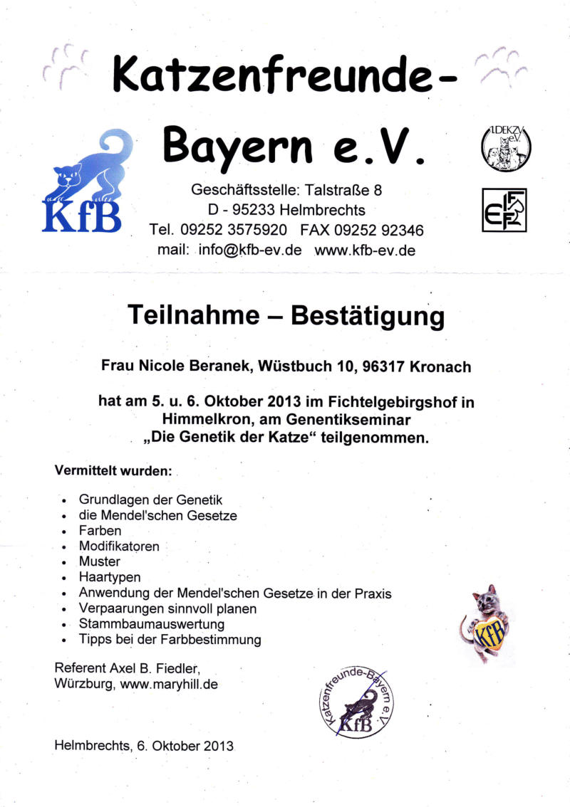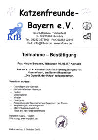 Natürlich versuche ich mich so gut es geht, in Sachen Katzenhaltung und Zucht weiterzubilden. Außer dass ich natürlich schon viele Jahre Katzen halte und täglich von unseren Katzen “unterrichtet” werde, habe ich schon einige Bücher gelesen und versuche, mich regelmäßig in Seminaren weiterzubilden. Diese Seminare/ Vorträge konnte ich bisher besuchen: Von April bis August 2016 habe ich am Online-Lehrgang “Katzenfutter von A-Z” bei Katzvard  teilgenommen. Ein Kurs der mir in 12 Wochen über dieses Thema sehr viel Wissen neu vermitteln und vorhandenes Wissen vertiefen konnte. Ich freue mich schon auf den nächsten Kurs dort… den ich nächstes Jahr belegen möchte. Vom 08. Februar 2016 bis 30. Mai 2016 habe ich am “PawPeds - The PawAcademy G3 Kurs” erfolgreich teilgenommen. Der G3-Kurs war der letzte Abschnitt von drei Kursen in einem Ausbildungsprogramm für Katzenzüchter, der mittlerweile in vielen Sprachen angeboten wird und weltweit unterrichtet wird. Die Wartelisten für die Kurse sind lang… Der Kurs fand ausschließlich über das Internet statt und war immens zeitintensiv Woche für Woche. Hier der Link zum Kurs, auf welchem auch die Kursinhalte ersichtlich sind und die bisherhigen Teilnehmer. Am 04. November 2015 hatte ich die Gelegenheit bei einem Online- Seminar der  Vetline Akademie teilzunehmen. Thema hier “Wissenswertes des Zuchtmanagments der Katze”. Hier konnte ich in einigen Dingen mein erworbenes Wissen vertiefen und auffrischen - und auch neue Dinge konnte ich lernen. Vom 21. Januar 2015 bis 15. April 2015 habe ich am “PawPeds - The PawAcademy G2 Kurs” erfolgreich teilgenommen. Der G2-Kurs ist der zweite Abschnitt von Dreien in einem Ausbildungsprogramm für Katzenzüchter. Der Kurs findet ausschließlich über das Internet statt. Hier der Link zum Kurs, auf welchem auch die Kursinhalte ersichtlich sind und die bisherigen Teilnehmer. Am 05. und 06. Oktober 2013 hatte ich erneut die Möglichkeit an einem Genetikseminar teilzunehmen. Referent war Axel B. Fiedler (www.marryhill.de). Hier konnte ich meine Genetik-Kenntnisse wieder auffrischen und vertiefen. Vom 04. April 2013 bis zum 24. Mai 2013 habe ich am “PawPeds – The PawAcademy G1 Kurs” erfolgreich teilgenommen. Der G1-Kurs ist der erste Abschnitt von dreien in einem Ausbildungsprogramm für Katzenzüchter. Der Kurs findet über das Internet statt. Hier der Link zum Kurs, auf welchem auch die Kursinhalte ersichtlich sind. Am 14. und 15. April 2012 war ich auf dem Genetikseminar von Sylvie Groenveld und Raymonde Harland in Plauen. Hier der Link zur Seite.