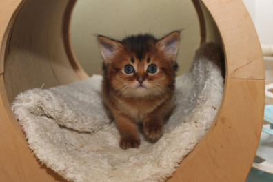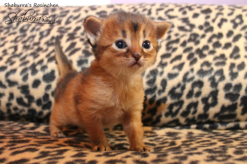 Nach fast einem Jahr Kittenpause… bekam ich langsam aber sicher Kitten- Entzugserscheinungen. Daher freue ich mich riesig, dass es mit der Deckung unseres Prinzesschen Fienchen mit dem tollen Olaf geklappt hat. Herausgekommen sind aus diesem Date 4 wildfarbene/ ruddy Somalibabys, die Fienchen zwar ein einer langen, aber absolut komplikationslosen Geburt das Leben schenkte. Anfangs war ich erschrocken über das kleinste Baby im Wurf… knapp über 60g… so ein kleines Mini-Mäuschen hatte ich noch nie und ich war gewappnet für evtl. hochpäppeln und Zufüttern… Aber die kleine Maus - das Rosinchen (der Name musste sein) hat das auch alleine alles geschafft und zeigte vom ersten Tag an im wahrsten Sinne des Wortes ihr Krallen. Alle drei nehmen kontinuierlich zu und so langsam herrscht Leben in der Wurfbox und dann gaaaanz bald im Kitten-Kindergarten und der restlichen Wohnung. Wir freuen uns riesig auf diese Kittenzeit im Herbst/ Winter.. genau die richtige Jahreszeit für Babys, wenn man ohnehin wieder mehr im Haus ist…
